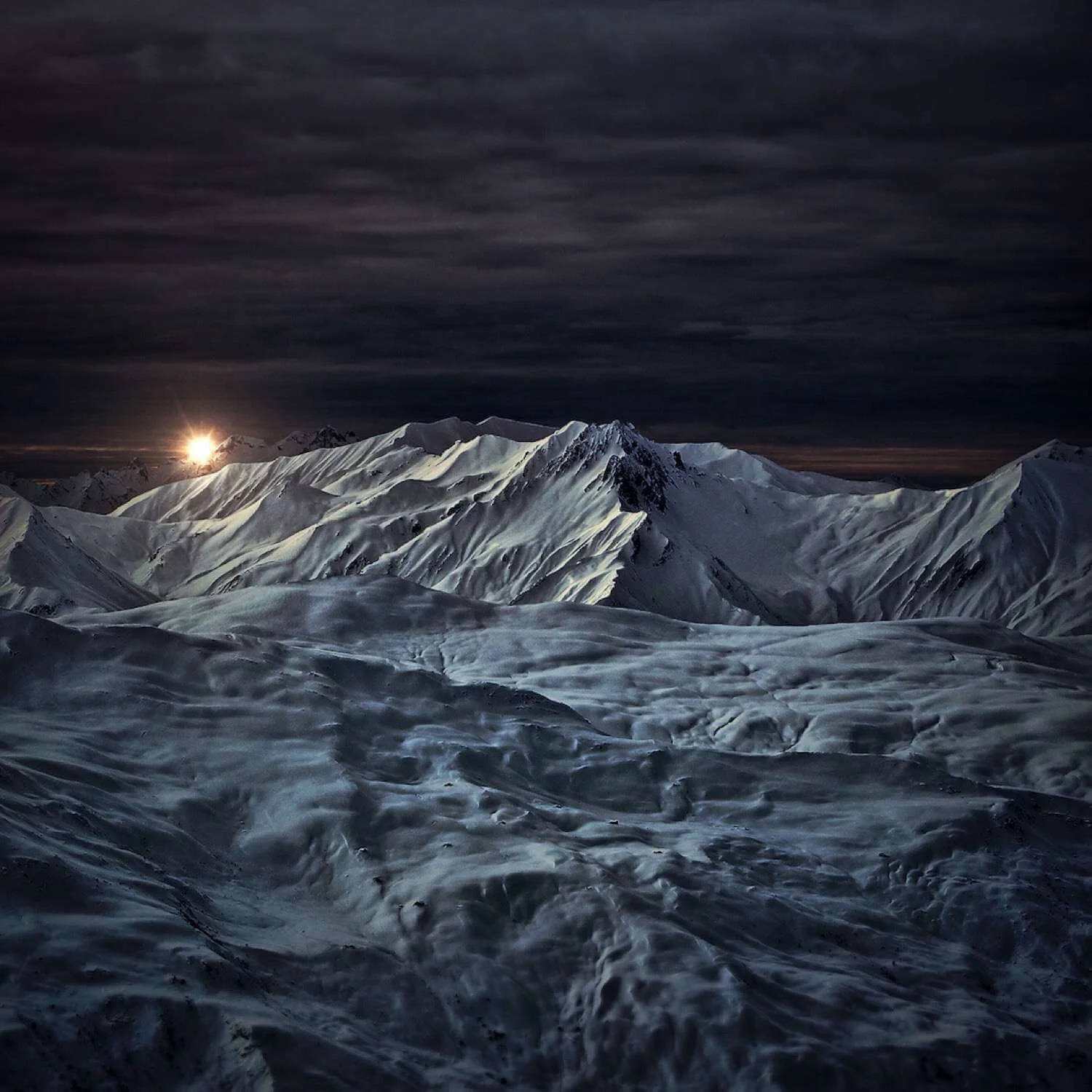 My first plan was to create a bright, symmetrical, image using only parts of the mountains and adding a touch of geometrical elements. After changing direction I ended up with this dark “synthetic” landscape instead.